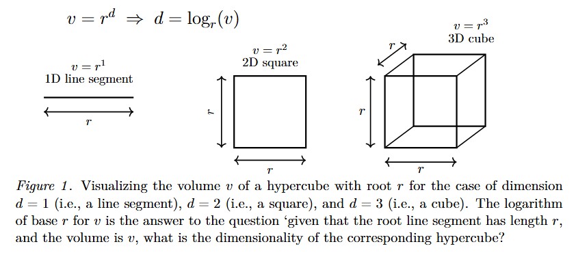 in words, r is the dth root of v. One question remains: given a volume v and a line segment of length r, what is the dimension d of the hypercube? For instance, if v=1000 and r=10, we may compute that d=3. This answer is in fact the logarithm of v with base r, that is: