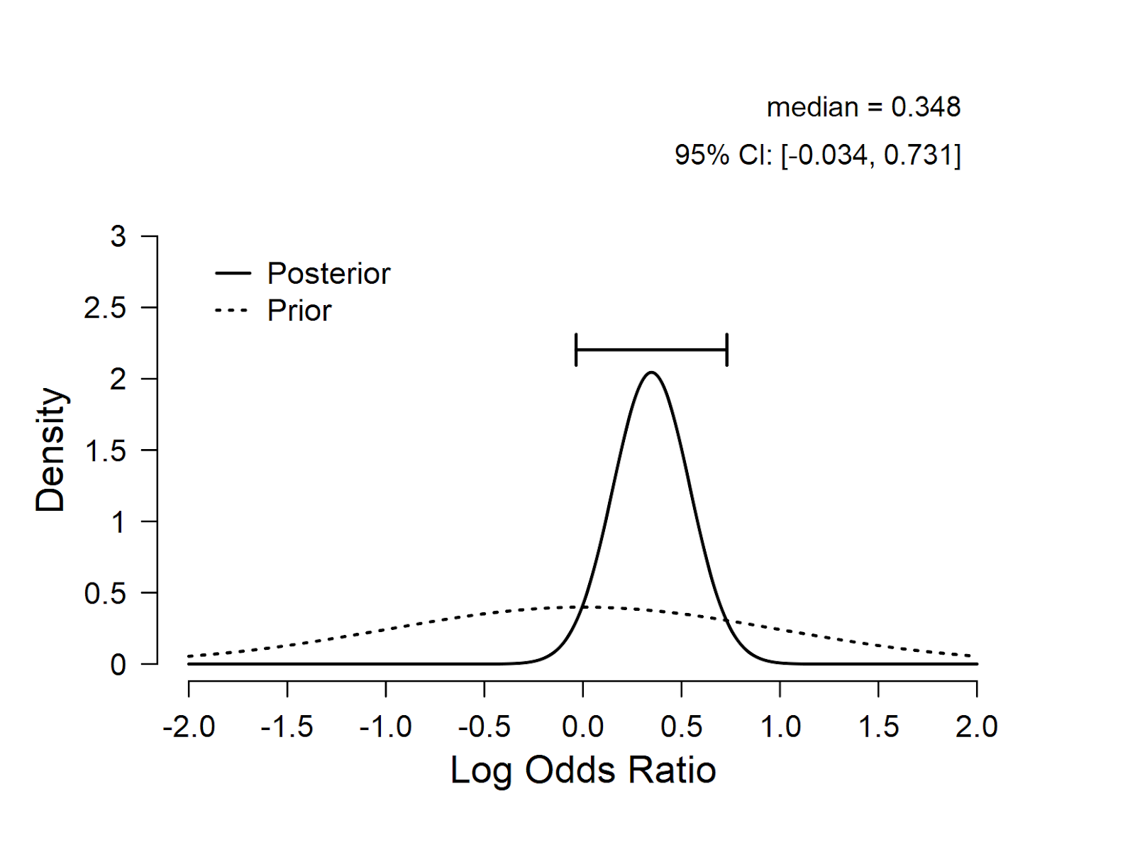 Below we use our default standard normal prior on the test-relevant parameter, which is the log odds ratio. The prior and posterior distribution for the log odds ratio are shown in the figure. The log odds ratio has a posterior median of 0.348, with most mass on positive values. This suggests that the new treatment is likely to be helpful rather than harmful.