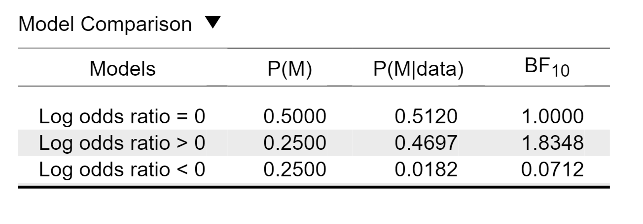 When we use a testing framework our default setting is to compare three hypotheses: (1) the treatment is ineffective (i.e., log odds ratio = 0; the idealized position of a hard-nosed skeptic); the treatment is helpful (i.e., log odds ratio > 0) and (3) the treatment is harmful (i.e., log odds ratio < 0). The resulting table output in JASP is here: