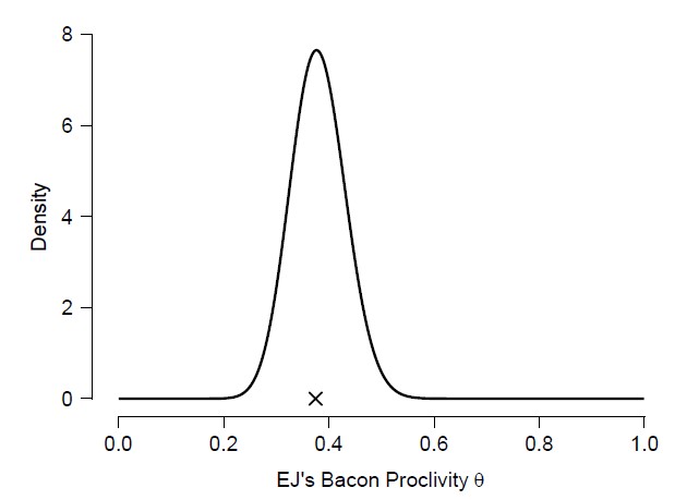 In my research master course “Bayesian Inference for Psychological Science” (co-taught with Dora Matzke), students are asked to specify a beta distribution on the probability θ that I will bake a bacon pancake rather than a standard “vanilla” pancake. So θ is my “bacon proclivity” that students are unsure about. The chapter “The pancake puzzle” from our free course book discusses the results from four pancake forecasters: Tabea, Sandra, Elise, and Vukasin. The chapter first presents their individual beta prior distributions, and then, after observing 3 bacon pancakes and 5 vanilla pancakes, it presents the associated posterior distributions: